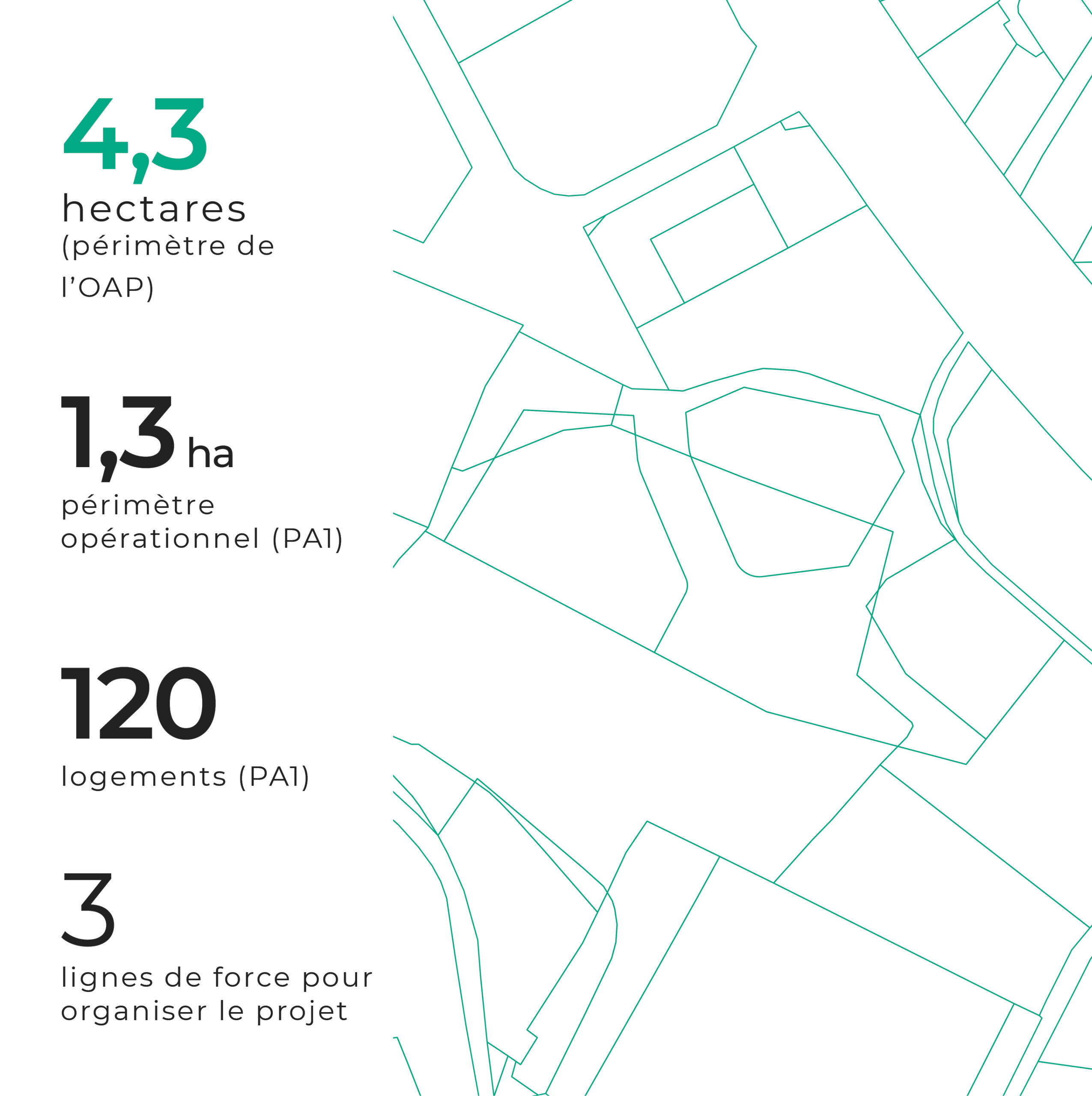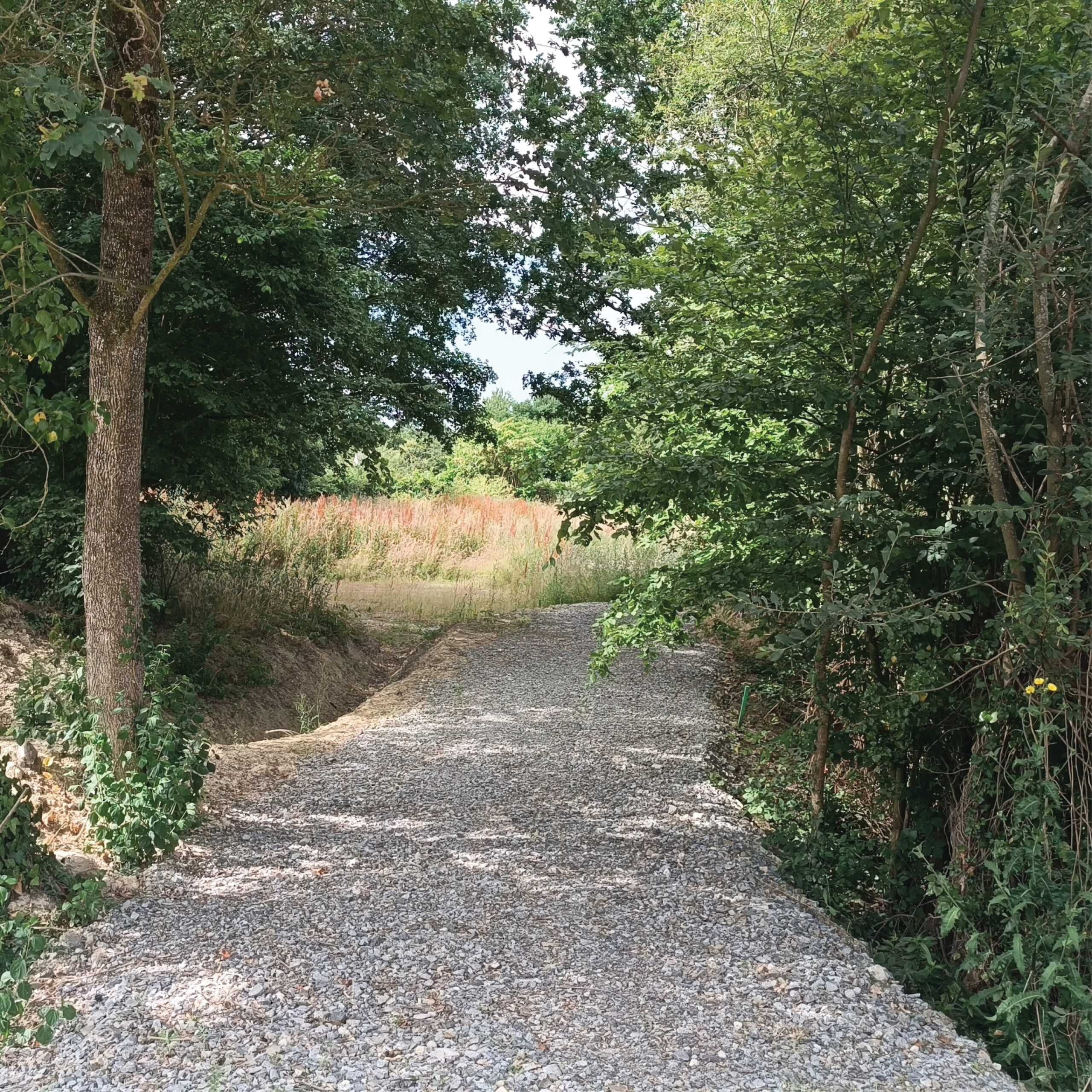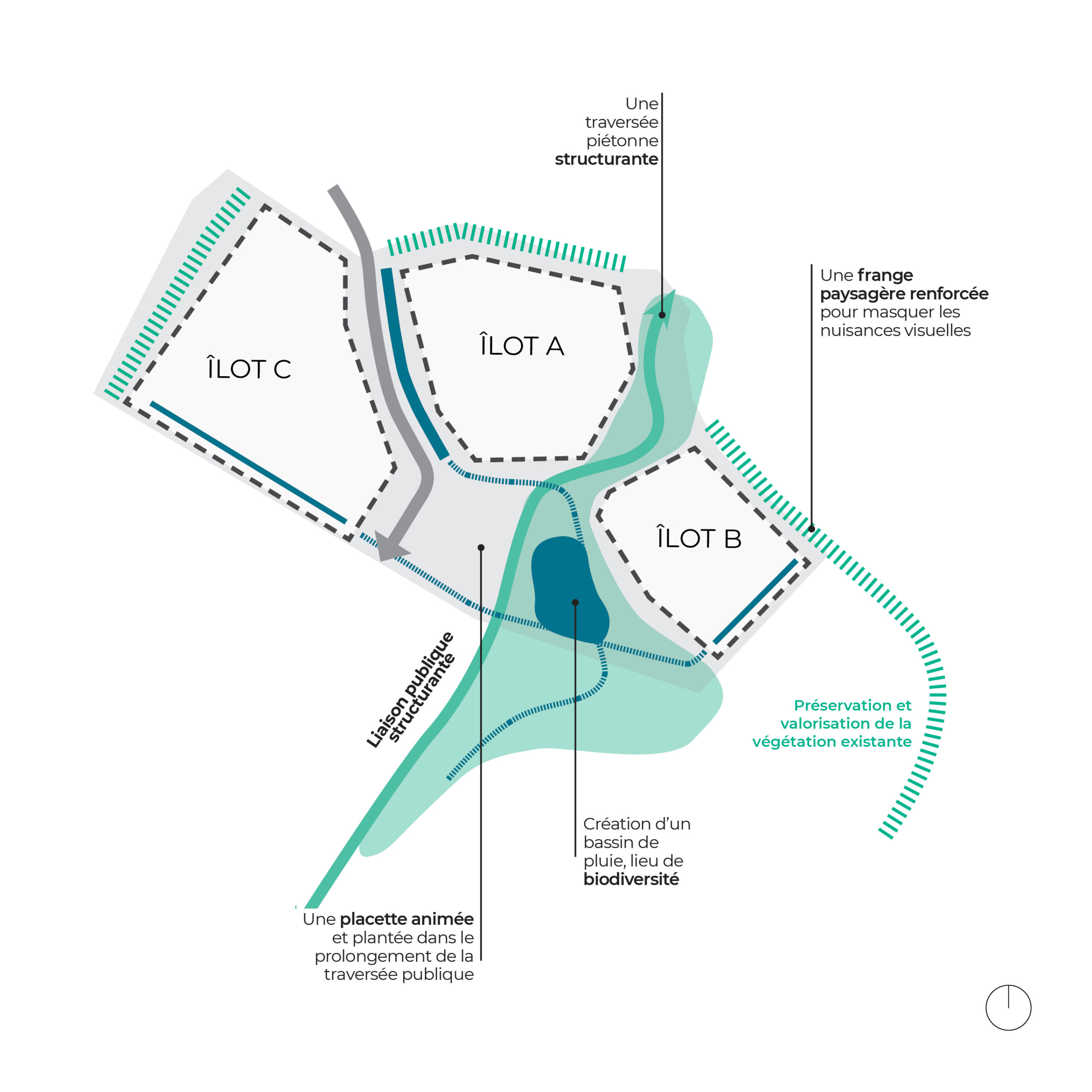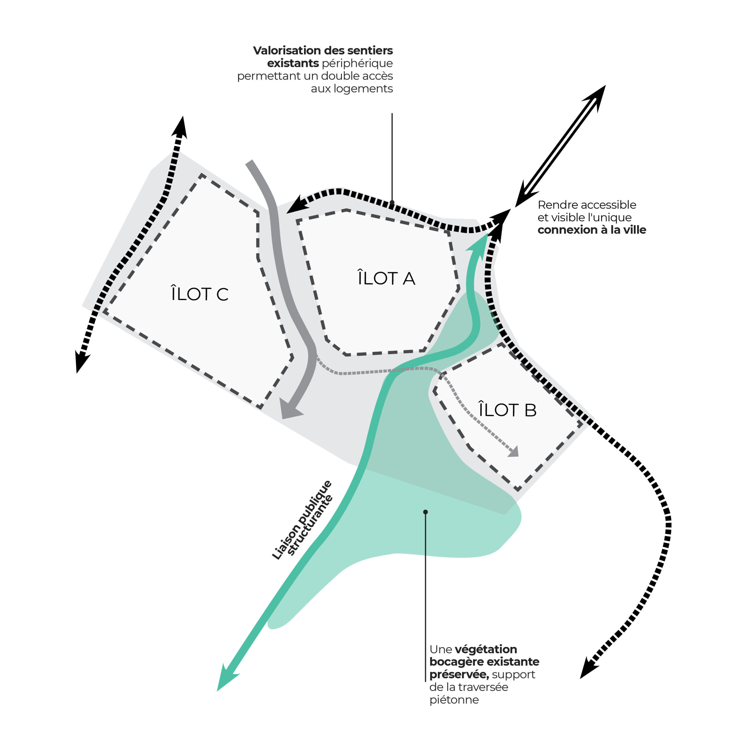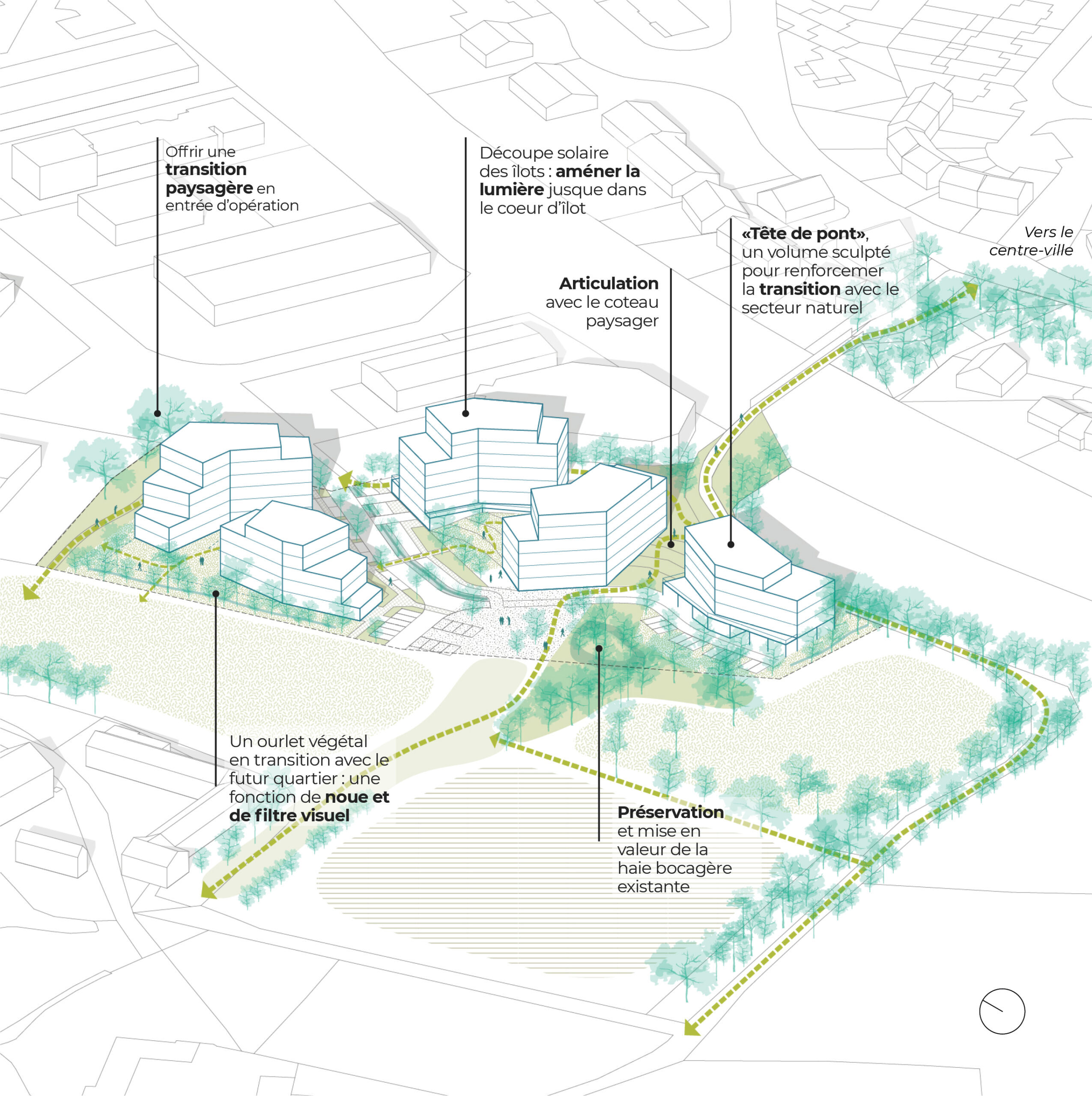 La reconsidération du périmètre initial a permis la préservation des tracés bocagers existants valorisant le patrimoine paysager du site. Les îlots viennent se répartir de part et d’autre de cette trame arborée devenue un axe structurant des mobilités douces reliant la ville au futur quartier. Profitant du relief du site, l’accès des bâtiments s’effectue selon des halls à double niveau connectés aux accès piétons existants longeant le site. La voirie, réduite à son maximum afin de limiter l’automobile, favorise les mobilités douces pour un quartier pacifié.