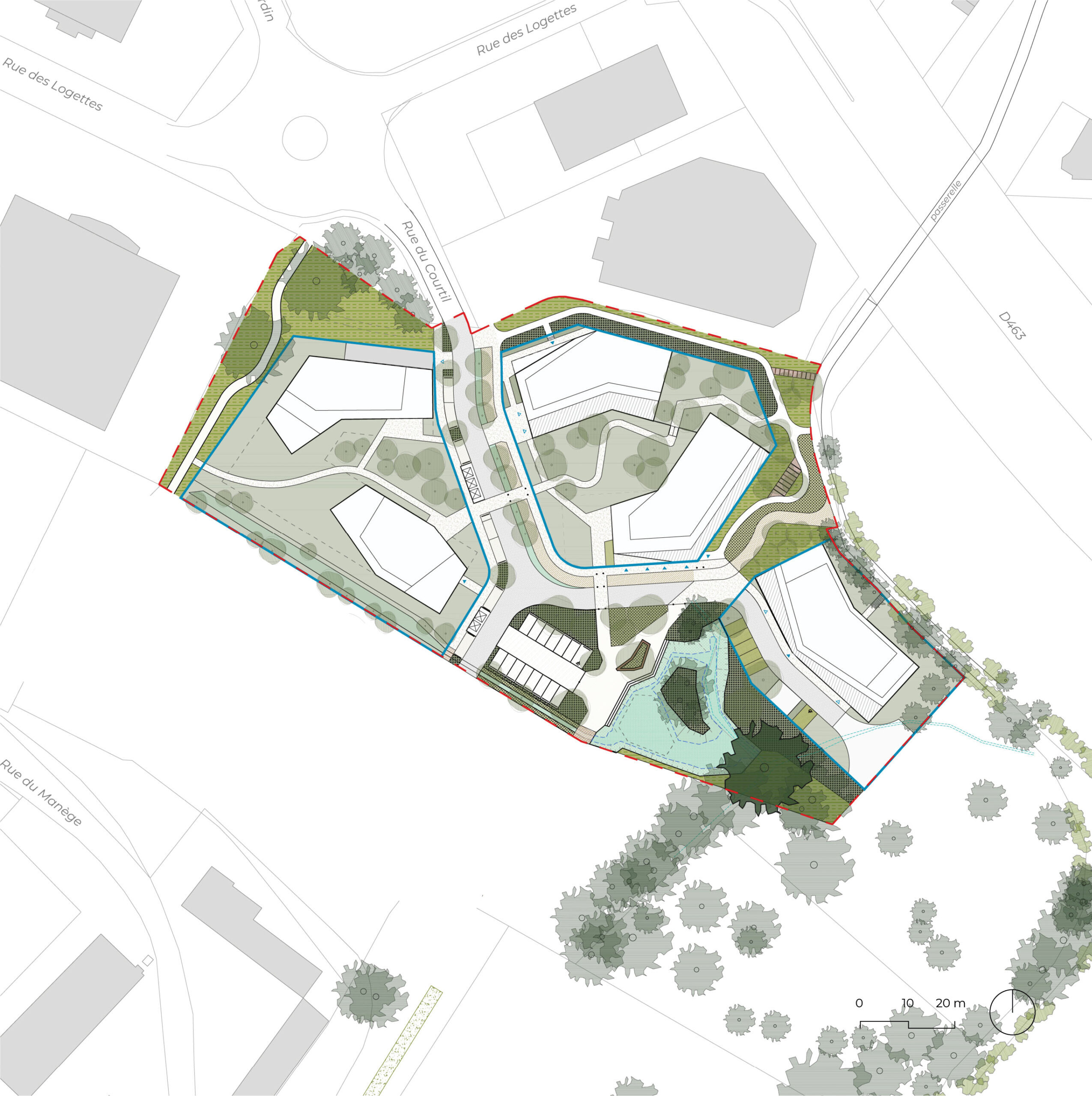 Le projet s’inscrit au sein d’un grand secteur d’OAP qui prévoit la transformation de la zone d’activité commerciale vieillissante des Loges en un quartier mixant habitations, commerces et bureaux, en lien avec un renforcement des transports en commun et une requalification des infrastructures routières. Il s’agit notamment de réarticuler ce secteur périphérique à l’agglomération de Chantepie, en atténuant la rupture créée par la route de Châteaugiron. Les bâtiments ménagent la végétation existante, qui devient un écrin paysager central pour les nouveaux habitants