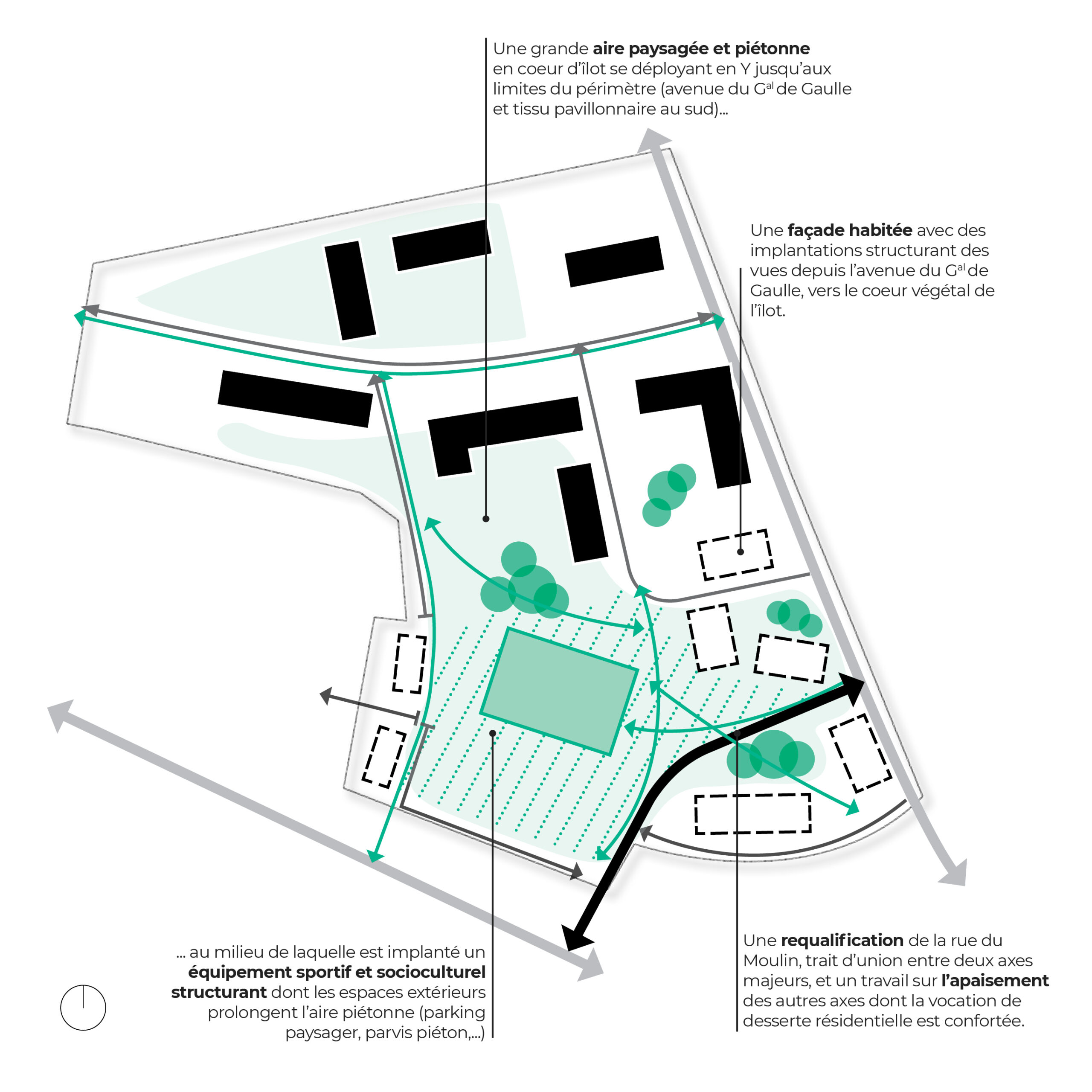 Si celle-ci entrevoyait déjà l’opportunité d’accueillir un nouvel équipement public sur l’emprise du stade voisin, la Ville a alors pu confirmer son intention d’y implanter un équipement sportif structurant auquel serait adossé un programme socioculturel. L’implantation possible de ce complexe et son échelle rendaient ainsi nécessaire une réflexion intégrant les enjeux d’adressage, de mobilité, de stationnement et d’espaces publics à l‘échelle du quartier élargi.