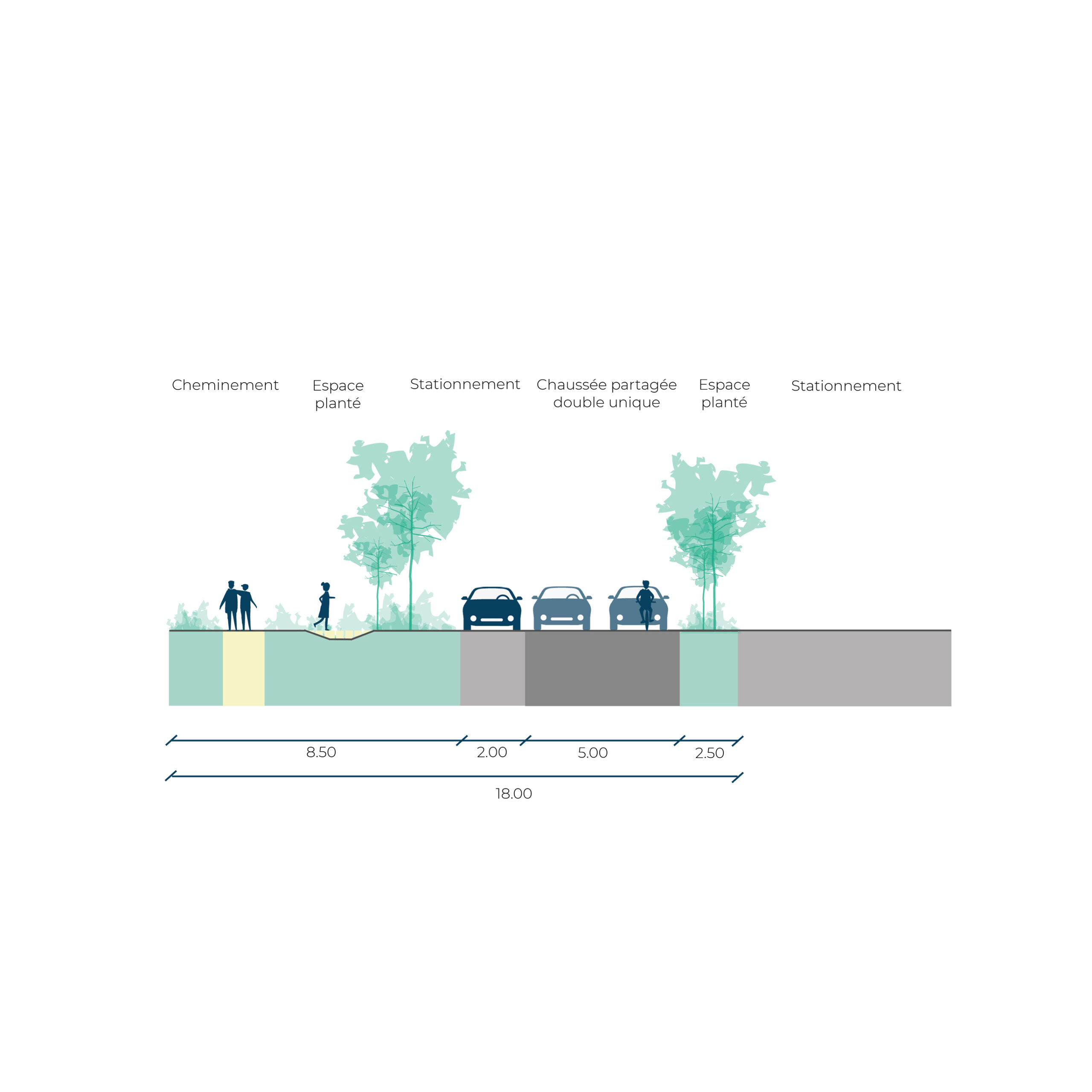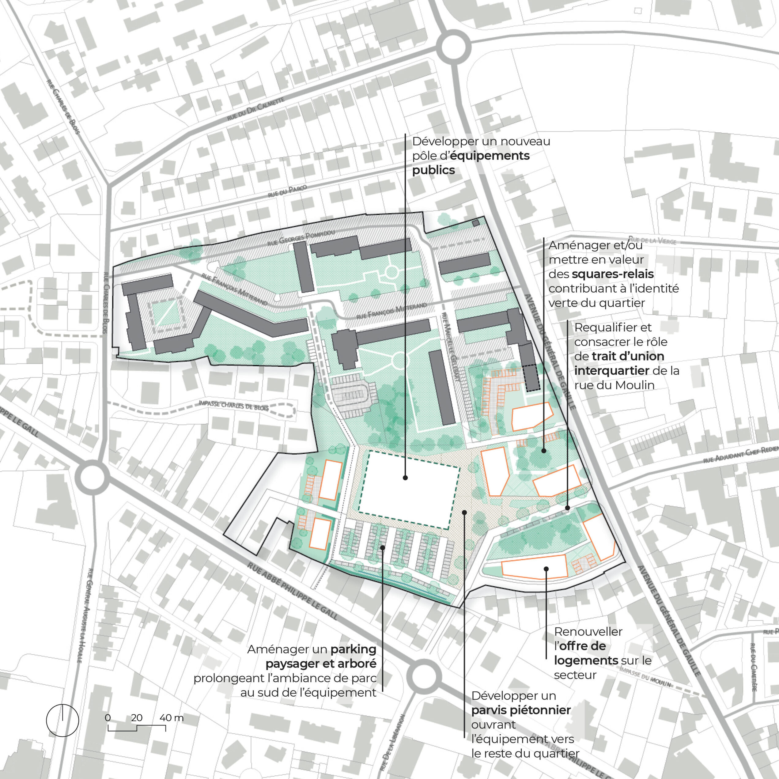 Pouvant impliquer des opérations de relogement et d’échanges parcellaires entre les deux propriétaires fonciers (Ville et bailleur), la scénarisation autour du renouvellement urbain a intégré les questions de phasage et de montage, tout autant que des objectifs de préservation de l’environnement arboré.