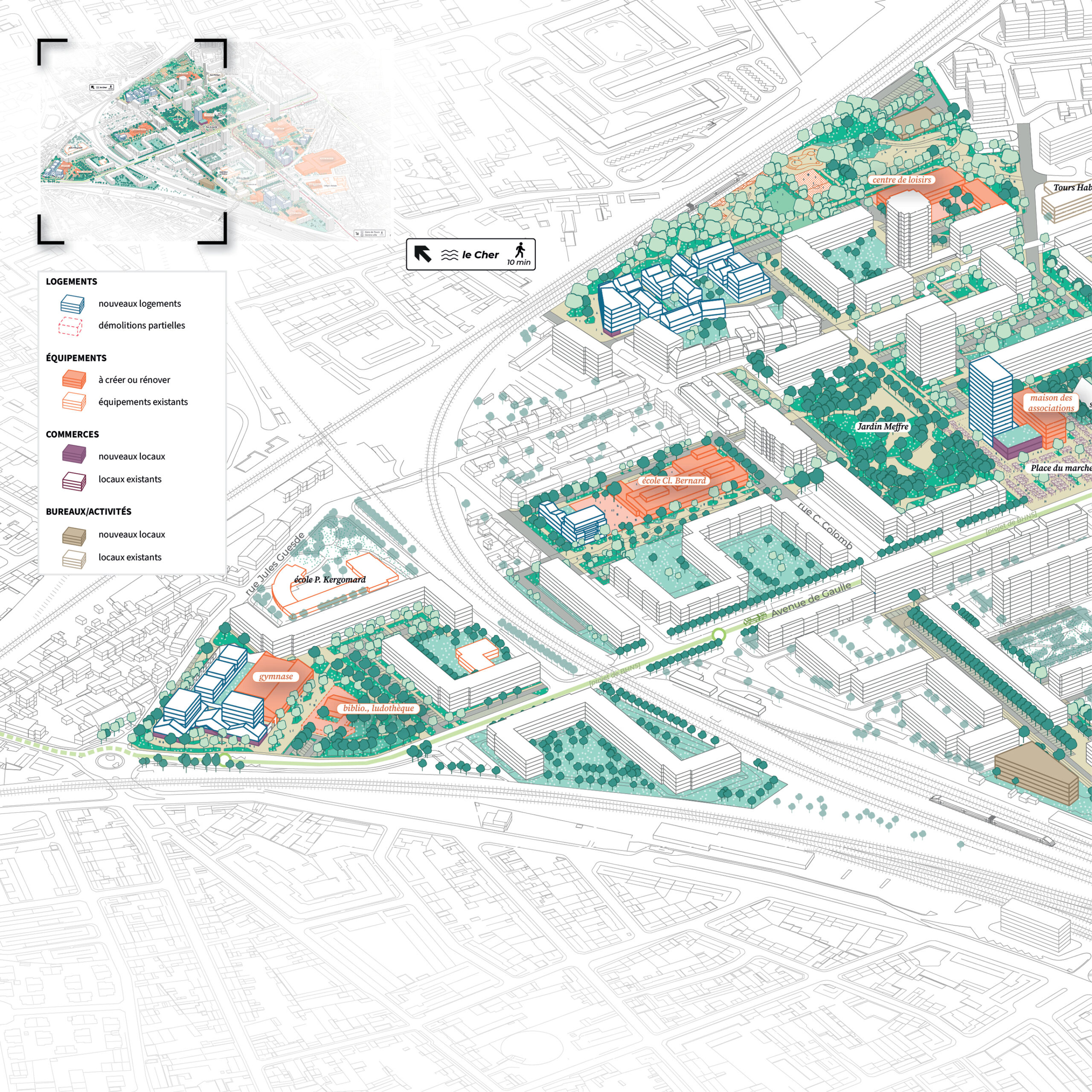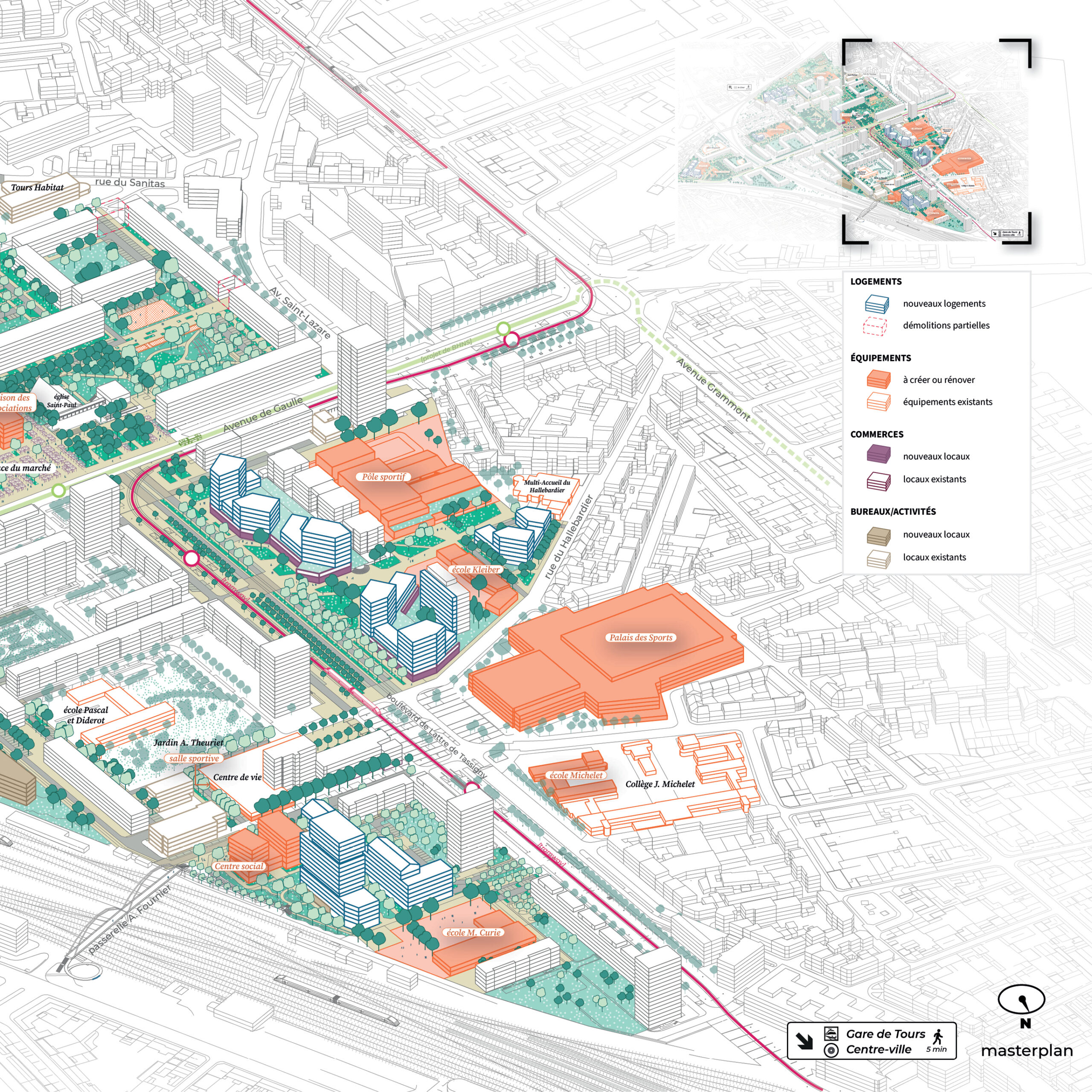 Mandataire d’une équipe pluridisciplinaire, masterplan a ainsi actualisé le plan-guide en croisant les regards, avec une approche à l’échelle du quartier et à l’échelle de chacun des huit secteurs d’intervention. Nous poursuivons notre mission par la coordination architecturale et urbaine des opérations et des aménagements.