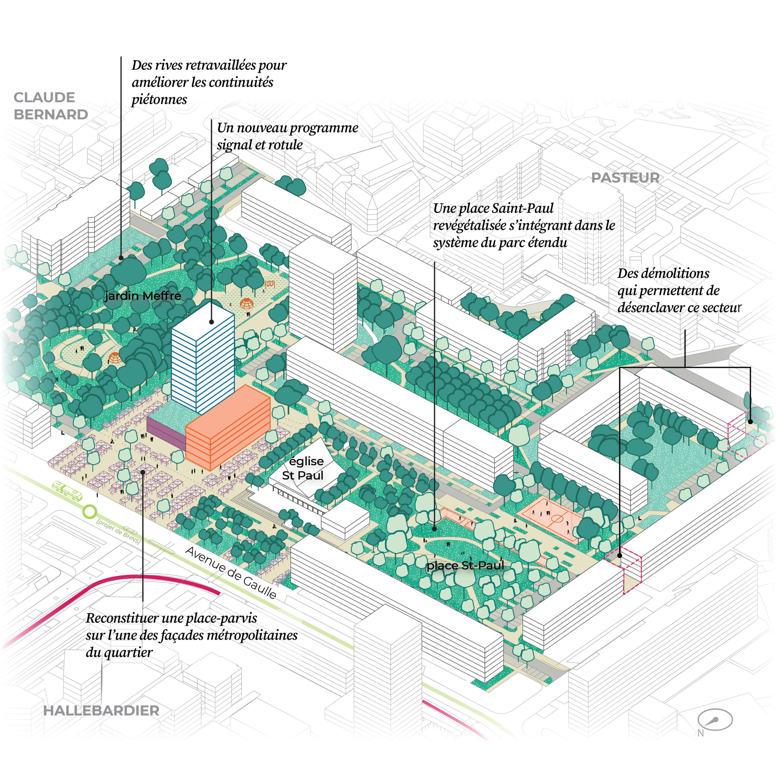 Chaque intervention vise à amplifier ces qualités tout en renforçant les continuités végétales et piétonnes. Le cœur métropolitain, autour du Jardin Meffre et du secteur Saint-Paul, est particulièrement valorisé, tandis que chaque secteur conserve une ambiance propre, pensée selon une logique de thèmes et variations. La maîtrise d’œuvre des espaces publics, confiée à plusieurs équipes et coordonnée par le masterplan, garantit à la fois cohérence et diversité dans la qualité des aménagements.