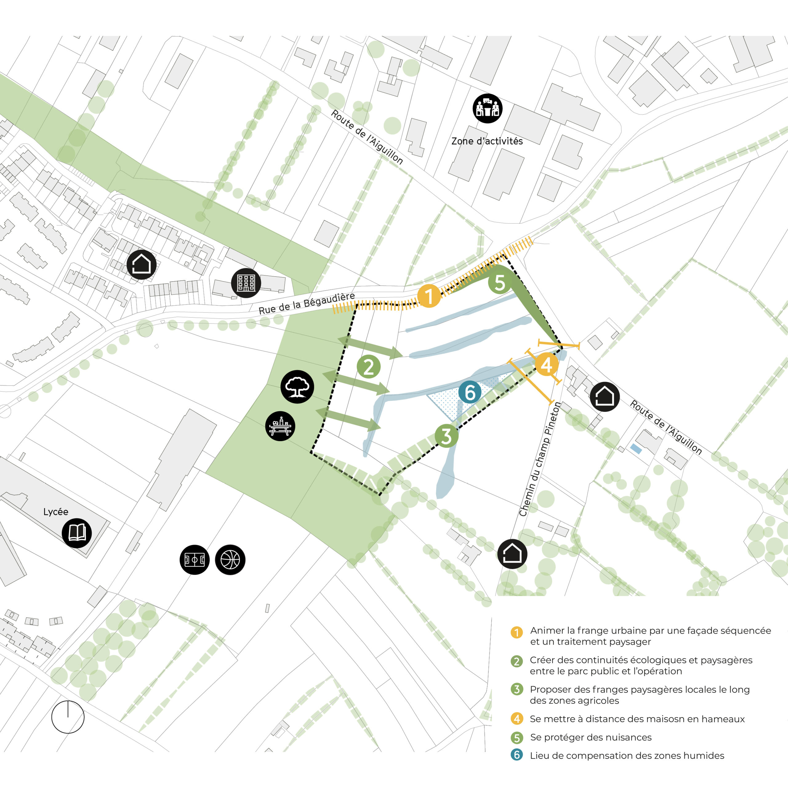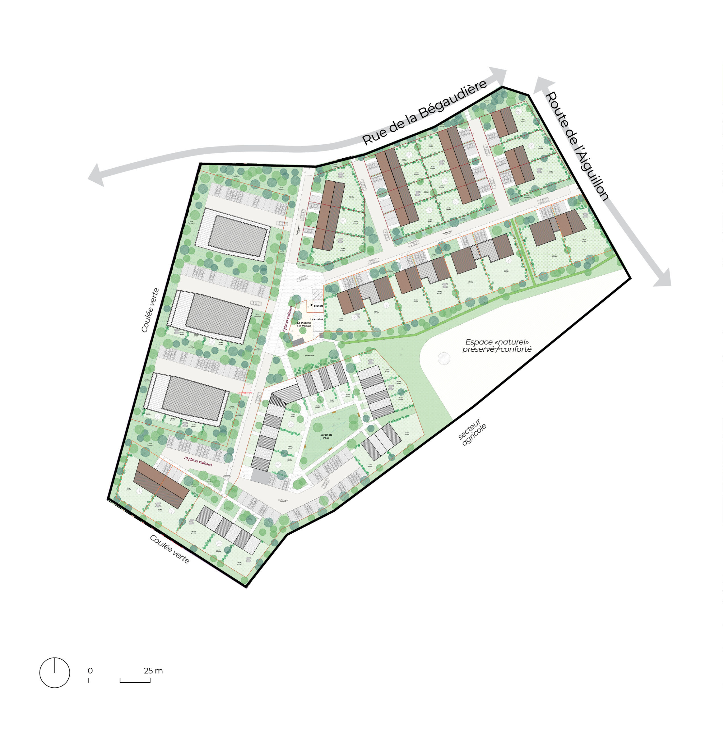 En s’insérant en lisière urbaine, le projet veille à s’intégrer finement sur ses abords et à développer un aménagement cohérent dans son cœur. Ainsi, il appuie ses lignes directrices sur les traces des anciennes haies bocagères, encore perceptible dans les écoulements du site. Il développe les formes urbaines plus hautes en ouverture sur la coulée verte généreuse à l’ouest et privilégie des constructions plus basses sur les limites plus rurales. Ainsi, depuis la rue de la Bégaudière, l’entrée de ville se fait avec une variation progressive allant des maisons individuelles jusqu’aux logements collectifs annonçant les immeubles existants bordant la rue aux abords du lycée.